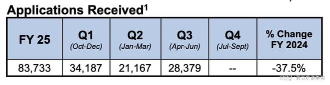 据统计,2025财年前三季度,美国劳工部一共收到了83,733份美国职业移民绿卡PERM申请,而2024财年前三季度PERM的申请量是115,153,2025财年比2024财年同期减少了27%。单独拎出来看一下第三季度的数据对比,2025财年第三季度只有28,379份PERM申请,这比2024财年的下降了37.5%。